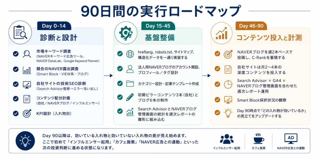Day 90以降は、効いている入れ物と効いていない入れ物の差が見え始めます。ここで初めて「インフルエンサー起用」「カフェ施策」「NAVER広告との連動」といった次の投資判断に進める状態になります。