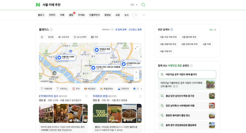 2020年末から2021年前後にかけて、このレイアウトに「Smart Block」という枠組みが段階的に導入され、検索意図ごとに最適なカテゴリのブロックが動的に差し込まれるようになりました。たとえば「ソウル カフェ おすすめ」と検索すると、「エリア別おすすめカフェ」「最近話題のカフェ」などの意図別ブロックが並びます。同じキーワードでも、検索するタイミングや他ユーザーの行動によってブロックの構成が変わる点は、従来の一覧型検索とは性格が異なります。なお、2022〜2023年以降、独立タブとしての「VIEW」はSmart Blockへ段階的に統合が進んでおり、ブログ・カフェのコンテンツはSmart Block内のブロックとして表示されるケースが増えています。